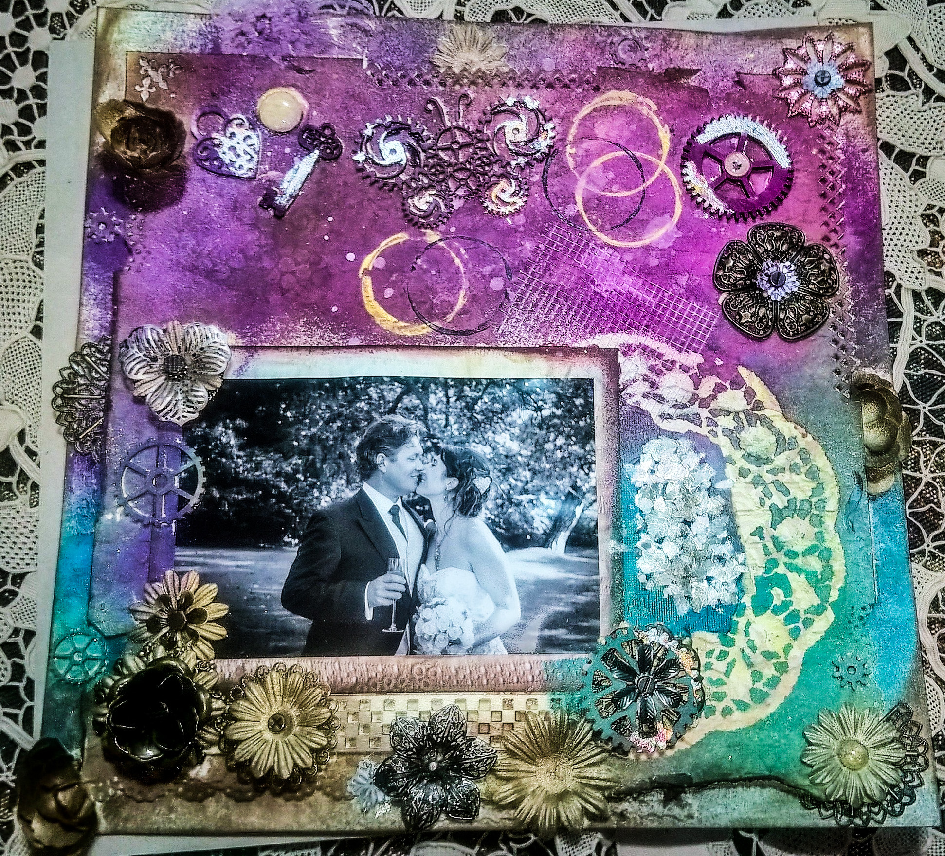Attachments include paper flowers, metal flowers, wooden steampunk embellishments, glass flat-backed marbles. I have used metallic sprays, and removed a lace doily after spraying so some of the original card pattern shows through. There is also metallic foil on some of the embellishments.
