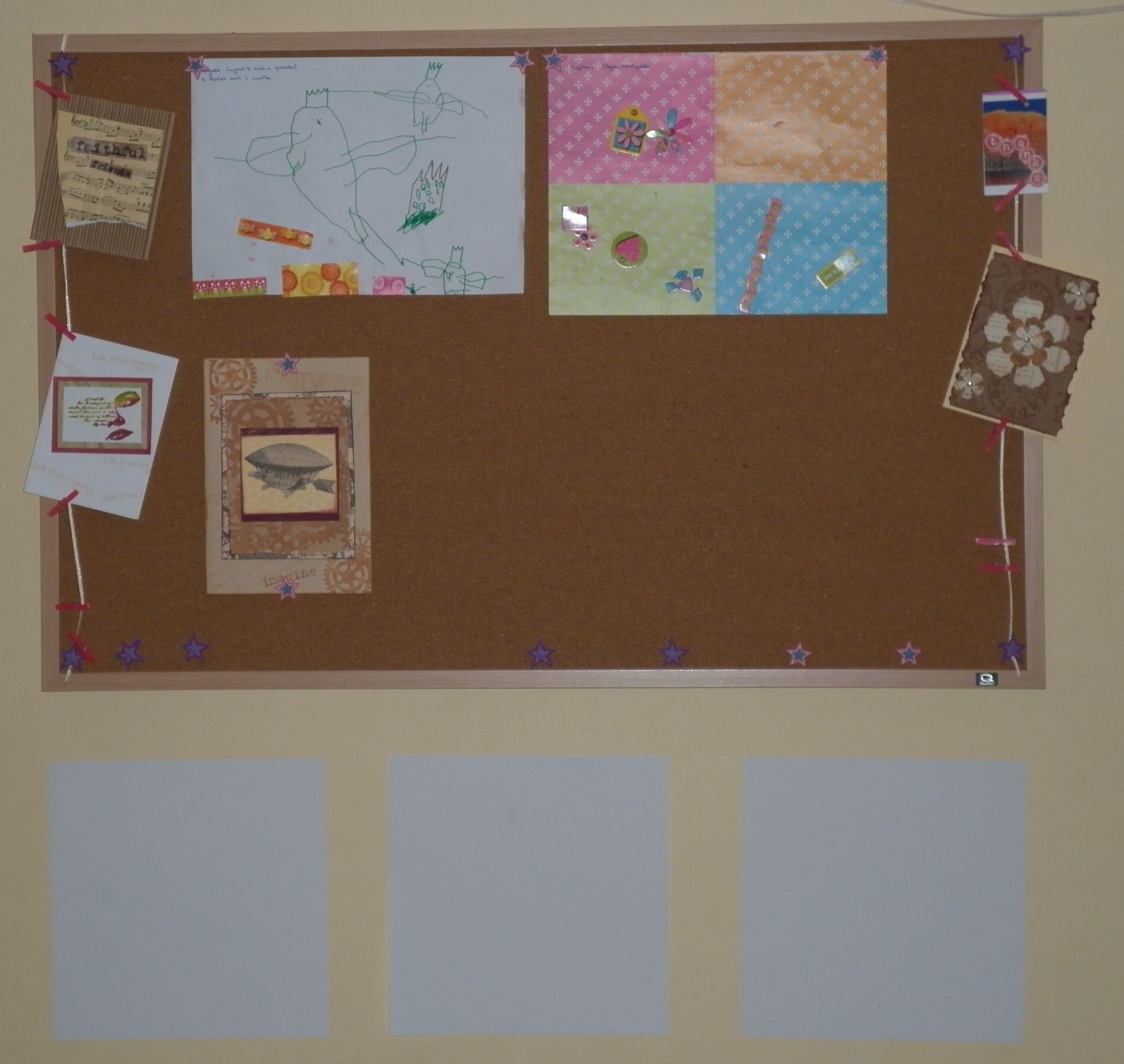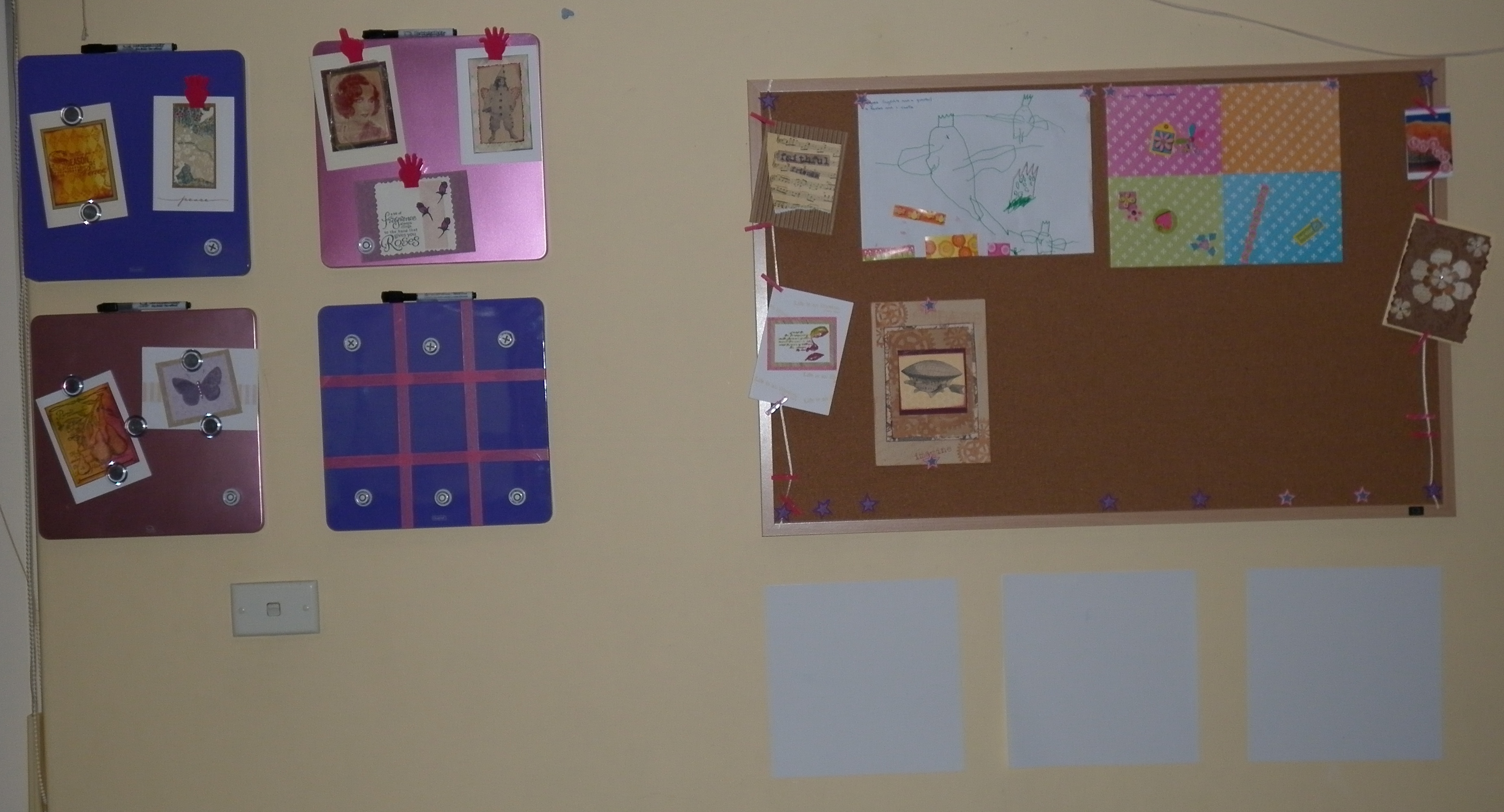 What I did not expect was for the girls to do me some artwork as a thank you, and to get a thank you card from Emma too. I was so excited to receive it! And then I realised that I had nowhere to display it. I don’t really have any of my own work up, except for a few mixed media canvases in a corner on mini easels. So I took myself off to Officeworks, got a corkboard, some coloured magnetic mini whiteboard panels, and some 3M sticky things, and set myself up with a craft display wall in the living room.