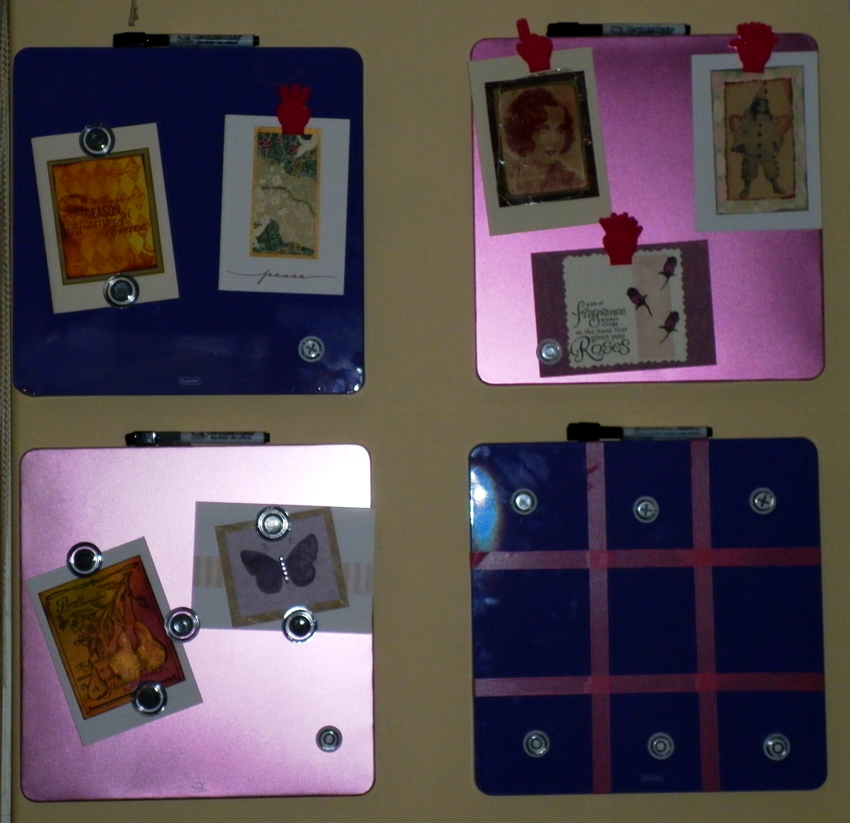 On the left: Four magnetic whiteboard panels, alternating colours. Top left is samples of Christmas cards from past years. Top right is various cards I have made while experimenting and decided to keep. Lower left is cards I made for someone who then didn’t want them and I put them in my sample folder. Lower right is turned into a Noughts and Crosses board using pink washi tape and with X and O magnets. I can change these items easily, they are held in place by magnets.