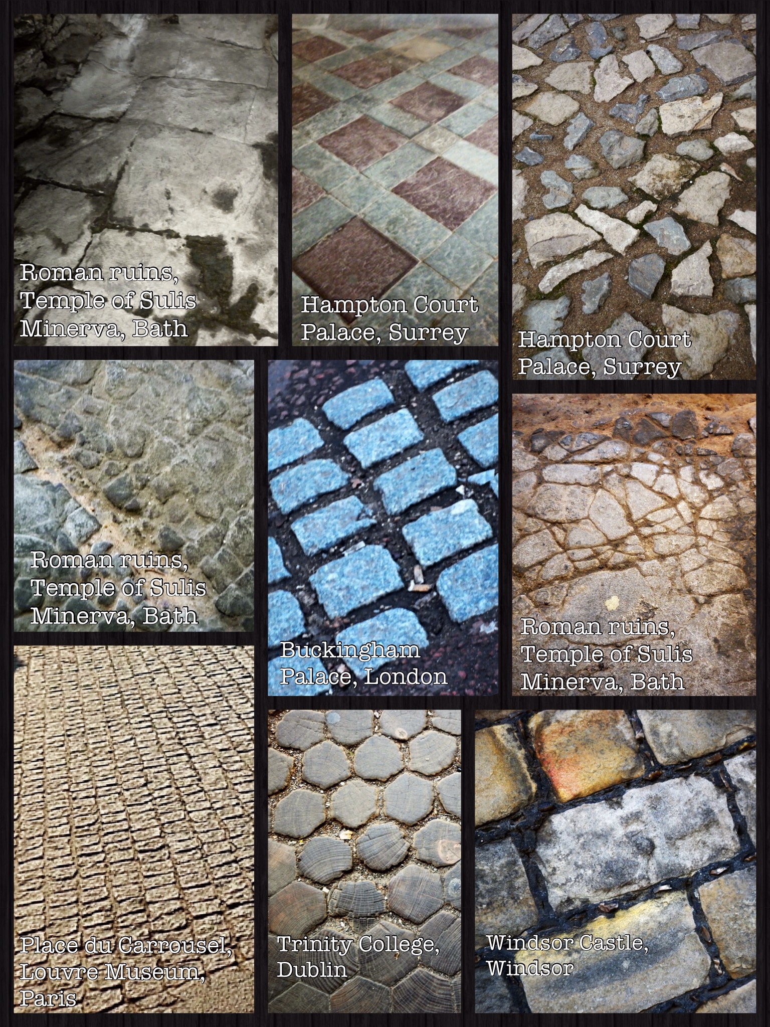 This first one is pavements – a mix of flagstones, cobblestones, brickwork and even hexagonal oak tiles (Trinity college).