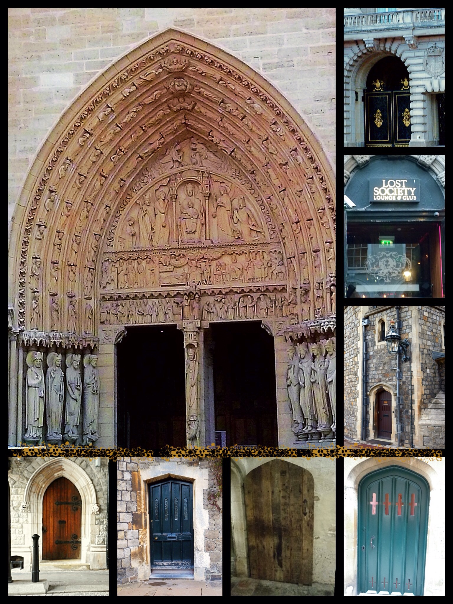 I didn’t label the doors, but I loved the different shapes and textures. The feature one is the Portal of the Last Judgement, Notre Dame Cathedral. From the top, the first two are in Ireland, then the door with the lamp is at Windsor Castle. Along the bottom the left door is at the Tower of London, the next is Windsor Castle, and the other two are from around Hampton Court – the brown door is from the Tudor kitchens. Obviously they are a mix of periods – medieval, Gothic, Tudor, Georgian. All gorgeous.