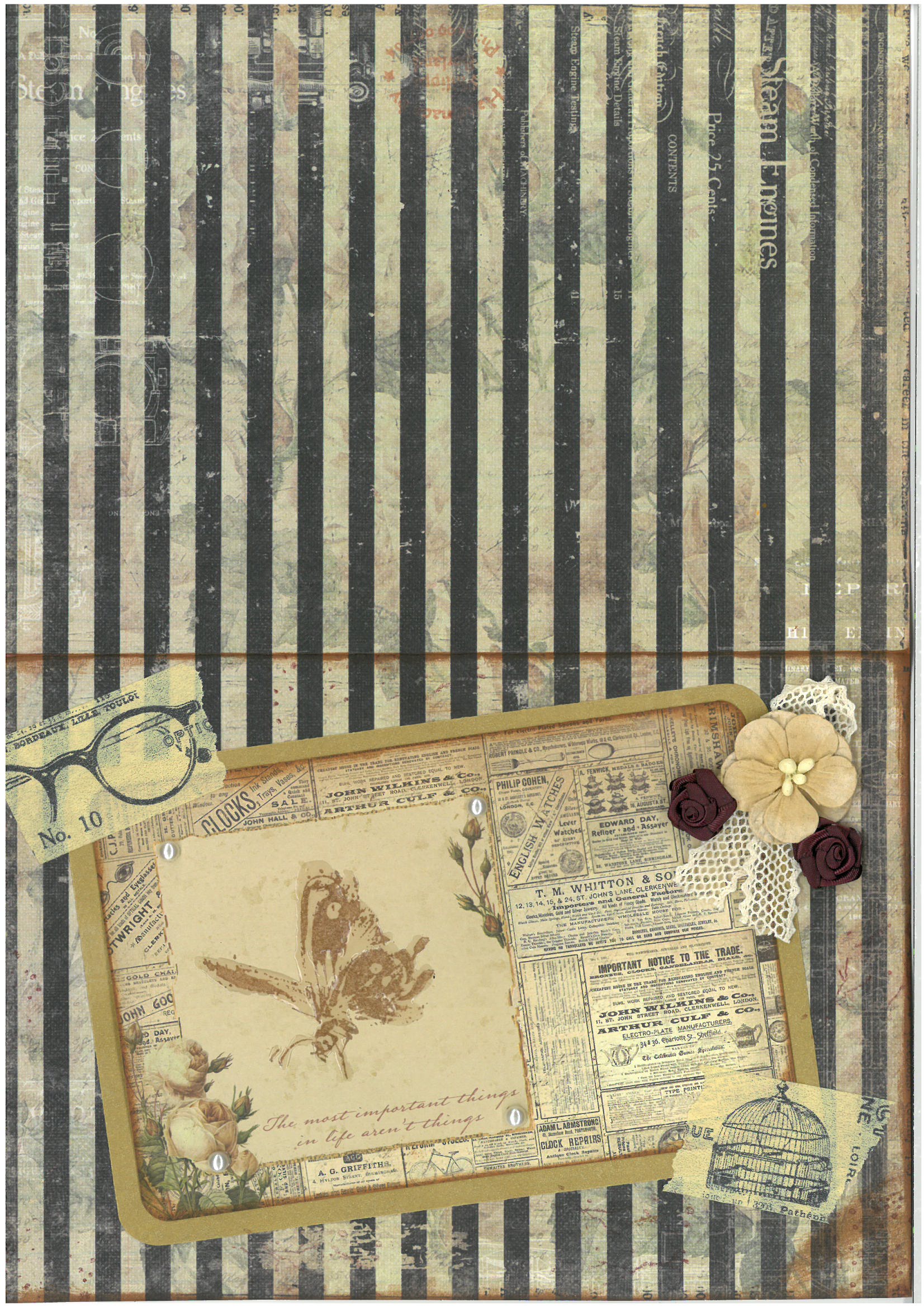 I made this card using the Prima Marketing collection Time Traveler’s Memories. It is a collection with beautiful creams, burgundy, sepia and black colours, and various vintage images. The base card is actually once piece – a gorgeous stripped and embellished bit of card – from the A4 pad, folded in half. Other elements have been layered on top, including flat pearls, a looped piece of lace and some roses.